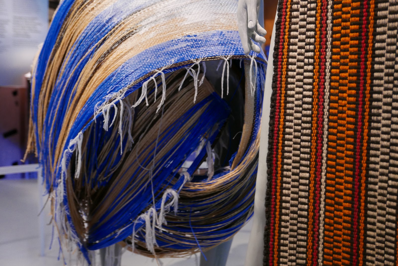 | Kleding van de in Ghana gebore Irene Agyeman Hin in Brilliant waxprint voor haar label Lady Africa Van Karim Adduchi, geboren in Marokko, maar afgestudeerd aan de Gerrit Rietveld Academie zijn twee outfits te zien die ik erg bijzonder vond. Uit de collectie 'She Knows Why the Caged Bird Sings'(2015) is rechts de bijzondere gevlochten rok te zien die om de heupen gewikkeld lijkt. Links staat een jurk uit de collectie 'Lives Behind the Courtyard Door' (2016) die bestaat uit een handgeweven lange strook.